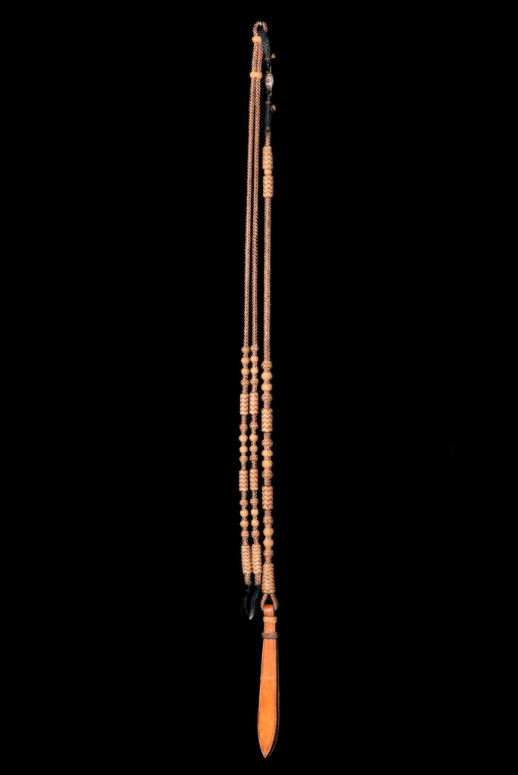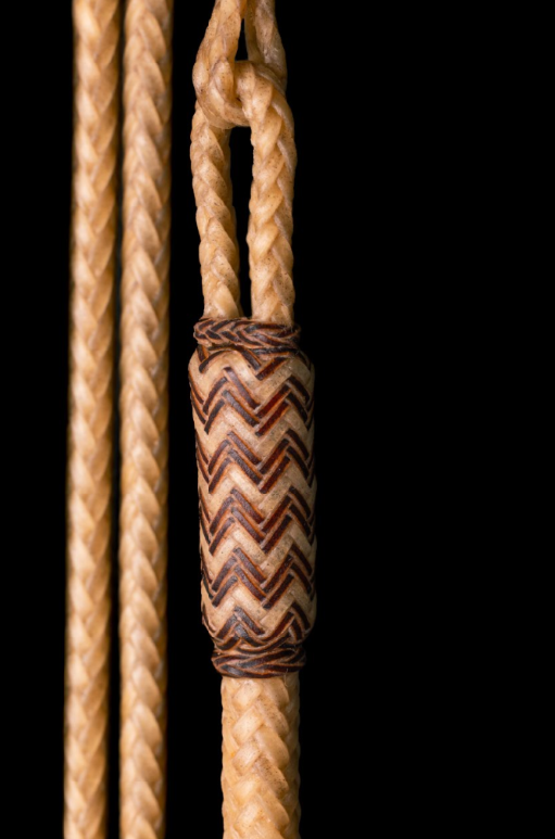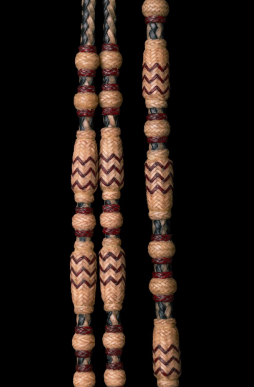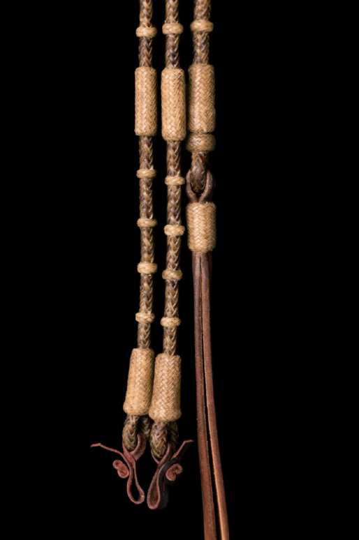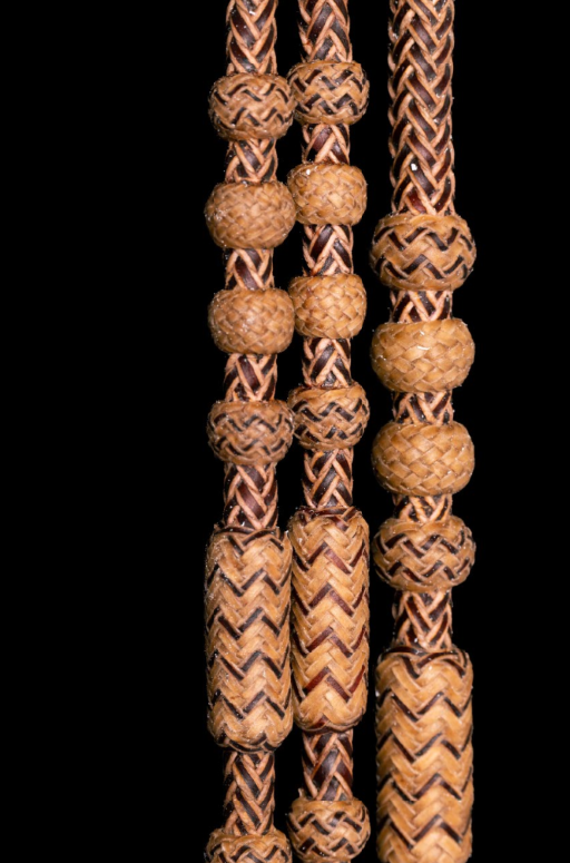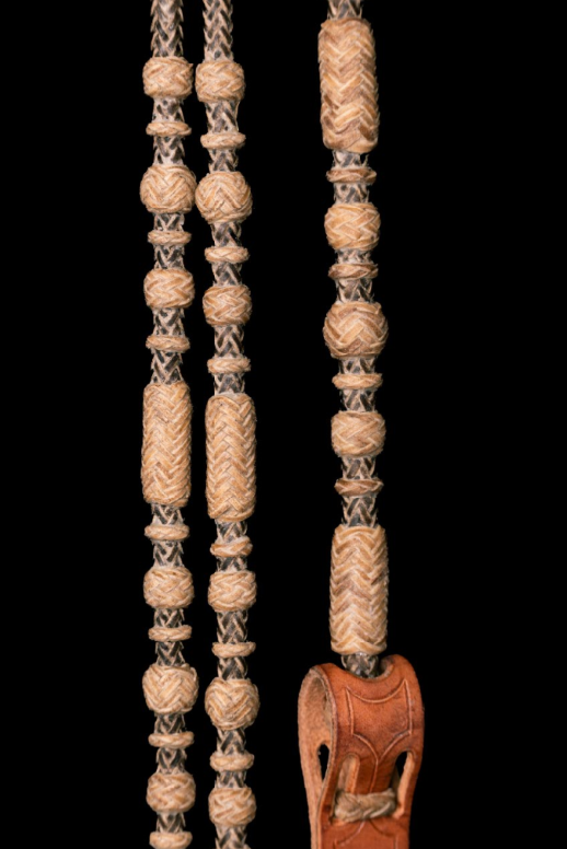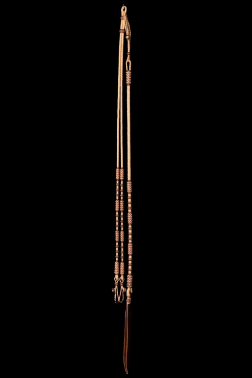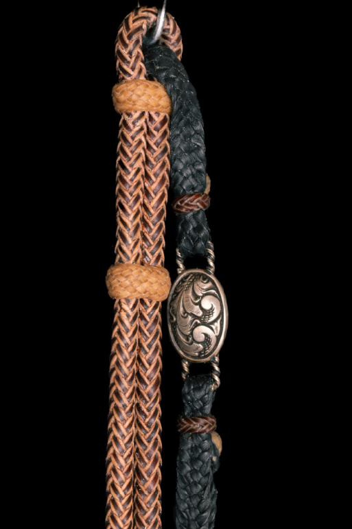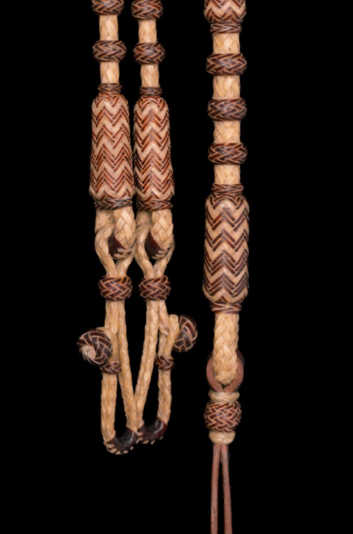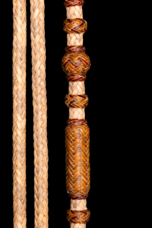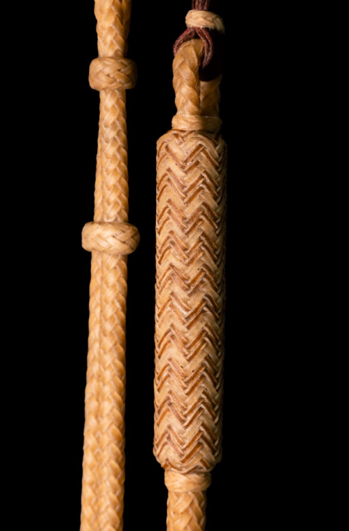 To preserve both the durability and functionality of the reins, I chose not to use ultra-fine button string. Instead, I worked with heavier string, which offers better abrasion resistance during real use. Dyed rawhide in two different shades was used for the decorative knots featured in the pattern.