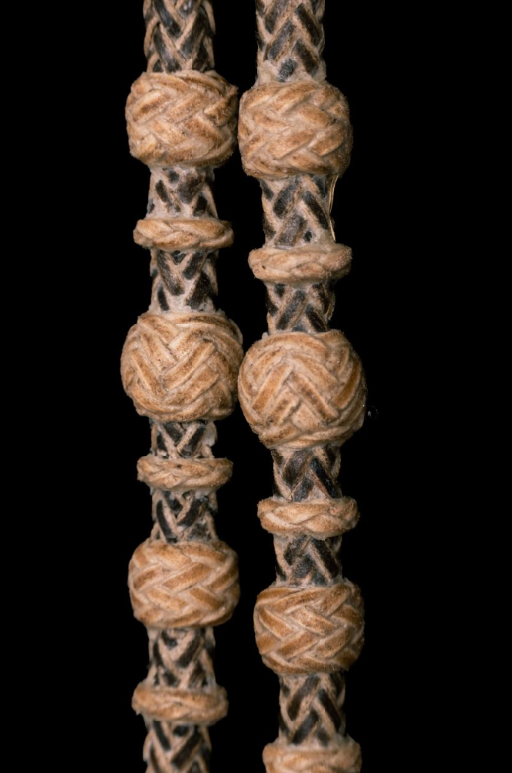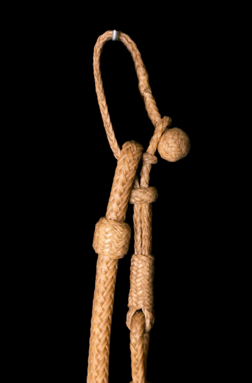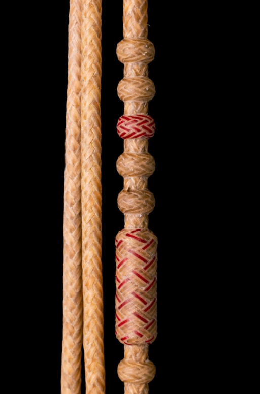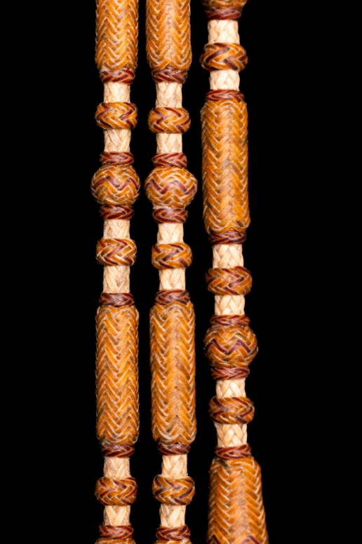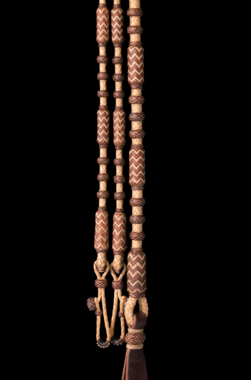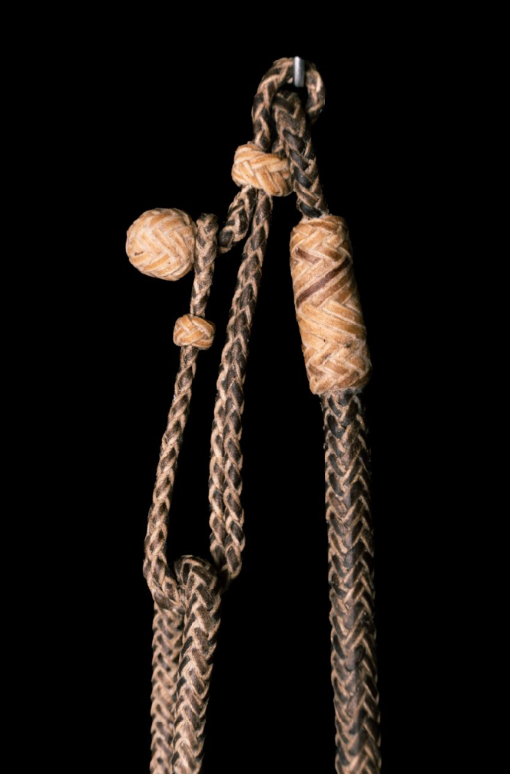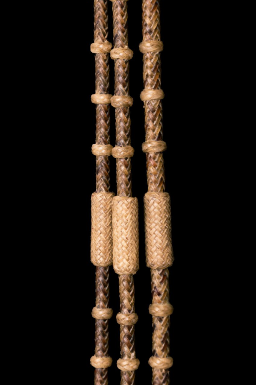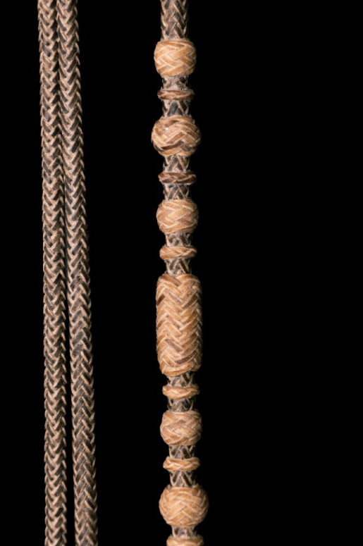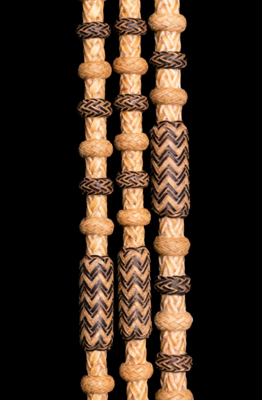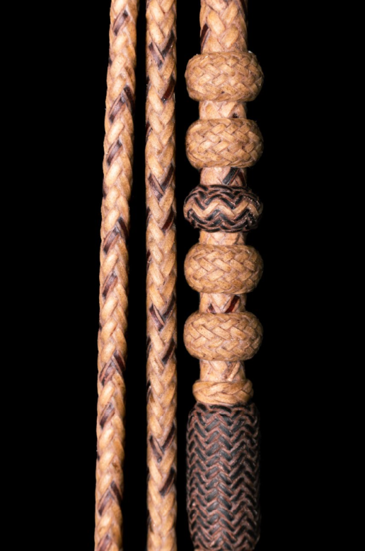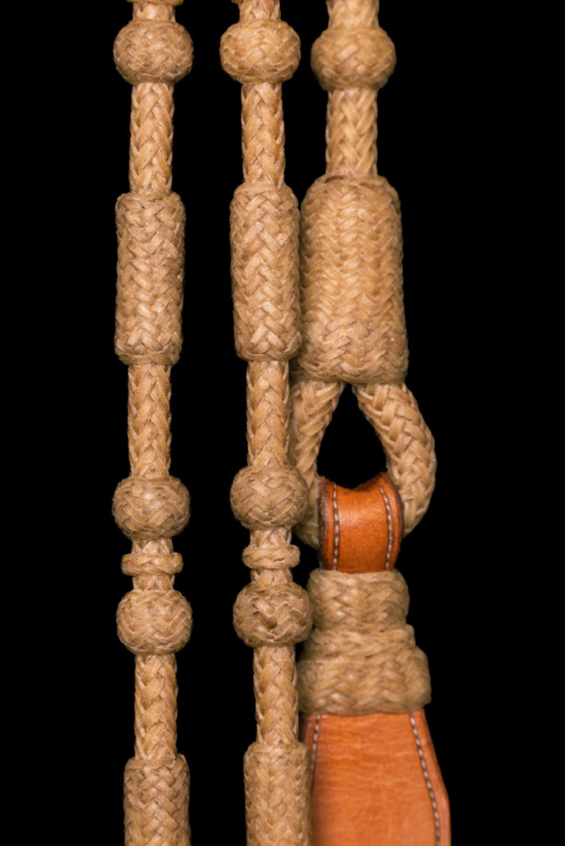 To preserve both the durability and functionality of the reins, I chose not to use ultra-fine button string. Instead, I worked with heavier string, which offers better abrasion resistance during real use. Dyed rawhide in two different shades was used for the decorative knots featured in the pattern.