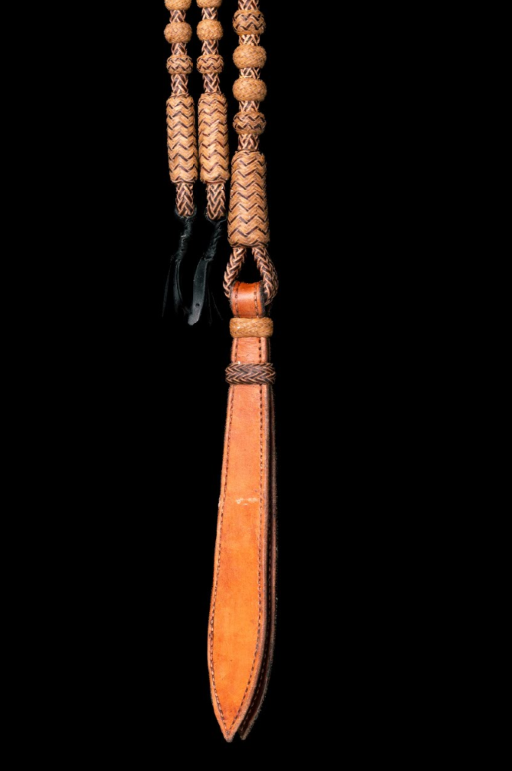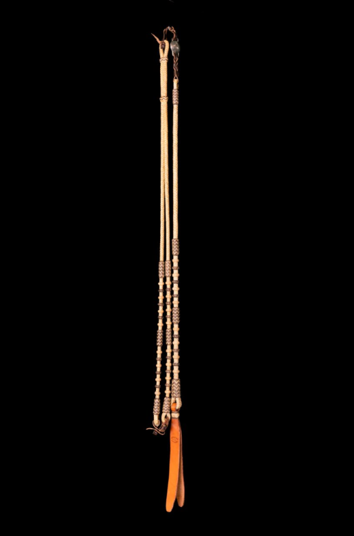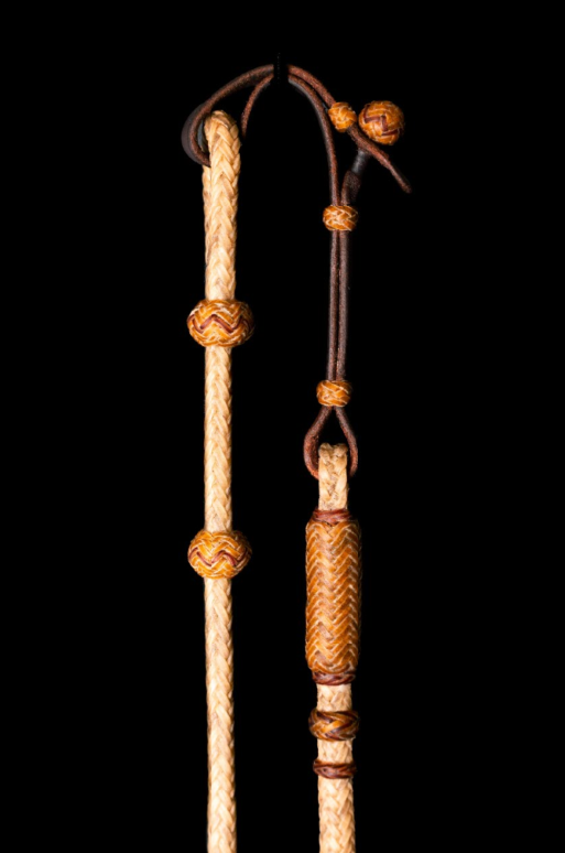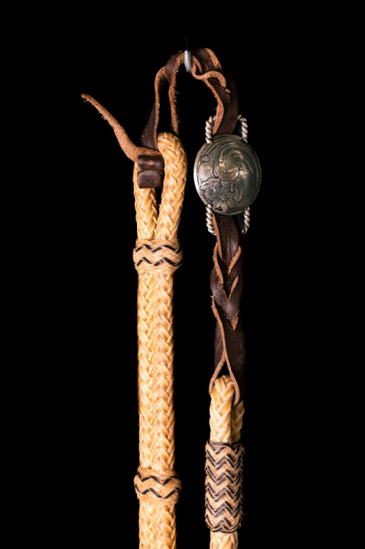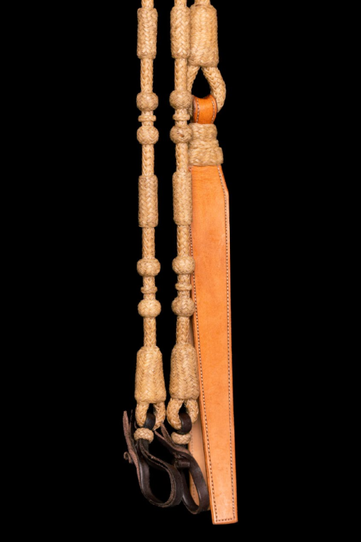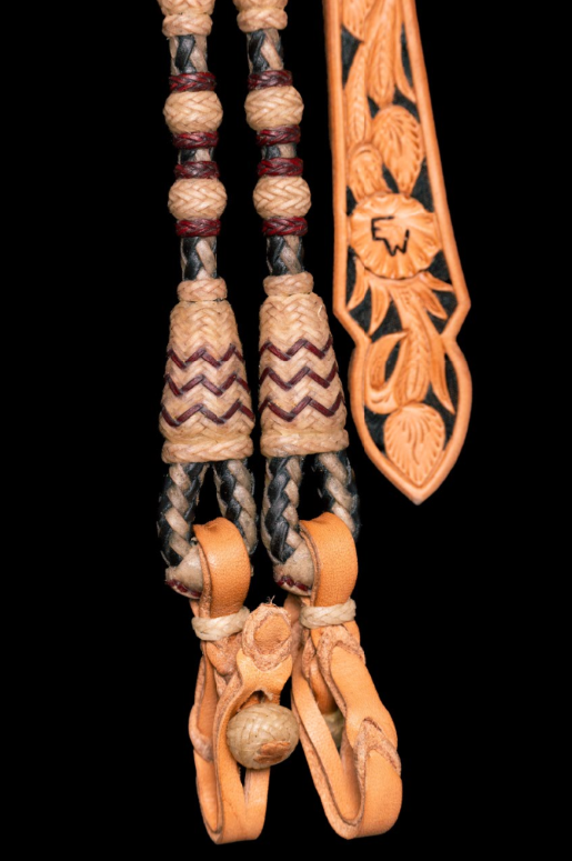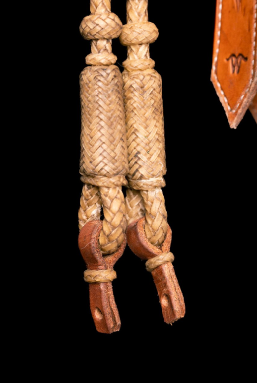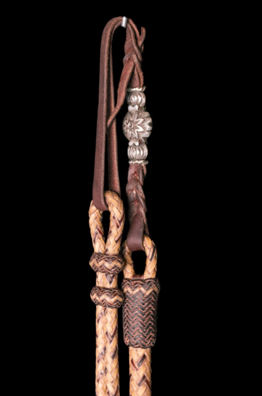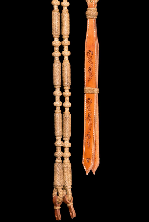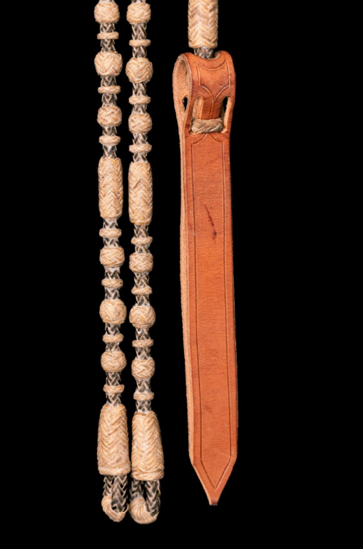 Complete Set with Rawhide Romal Reins made and donated by Bret Haskett and his wife, Melanie. Made from a natural rawhide, the reins are an 8 plait rein by 12 plait romal with a custom knot pattern for balance.