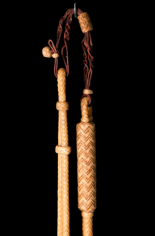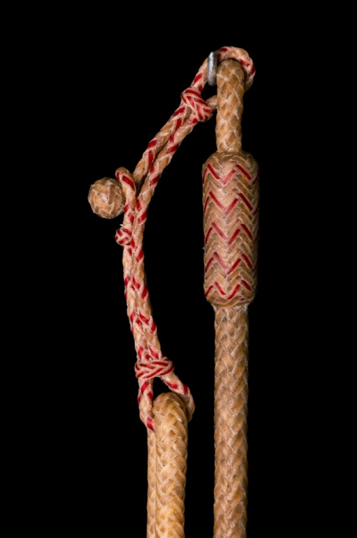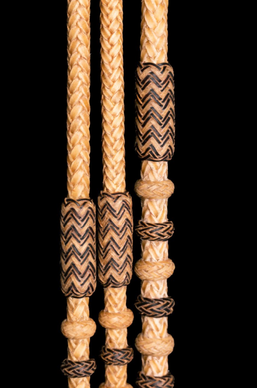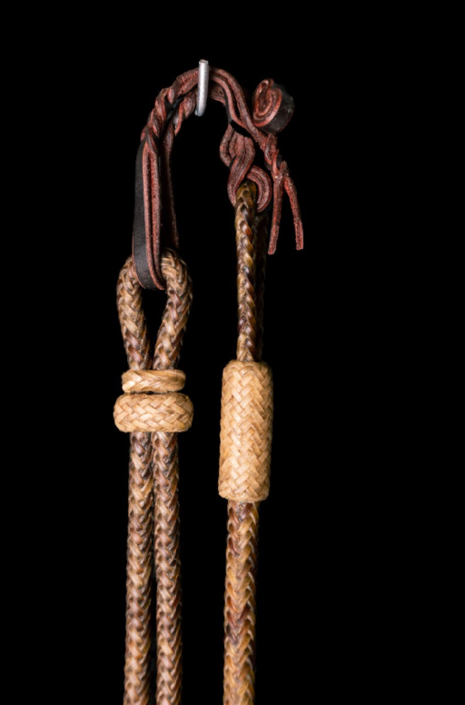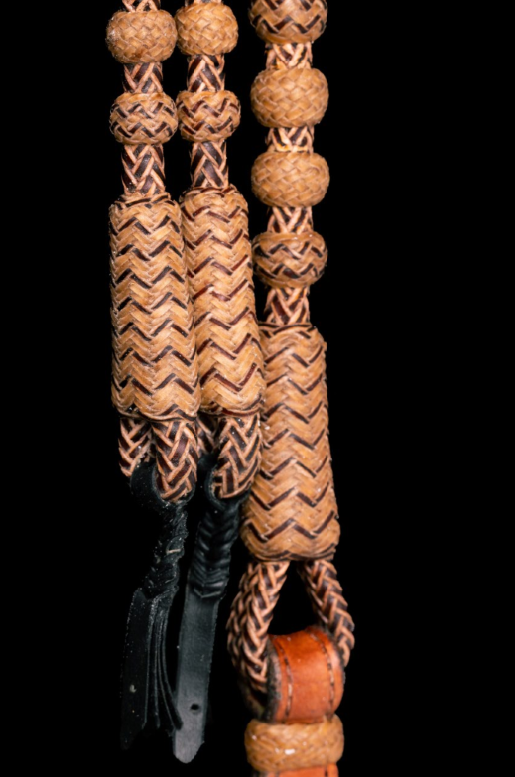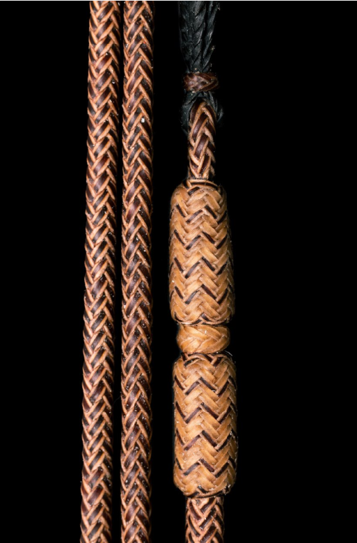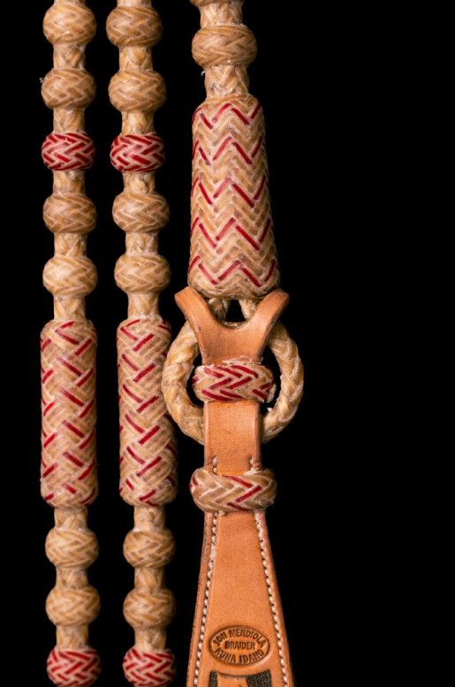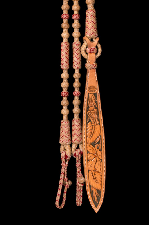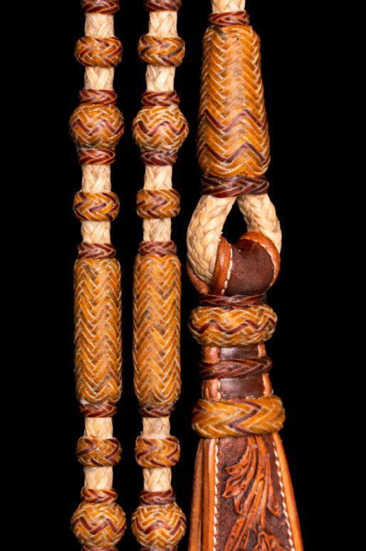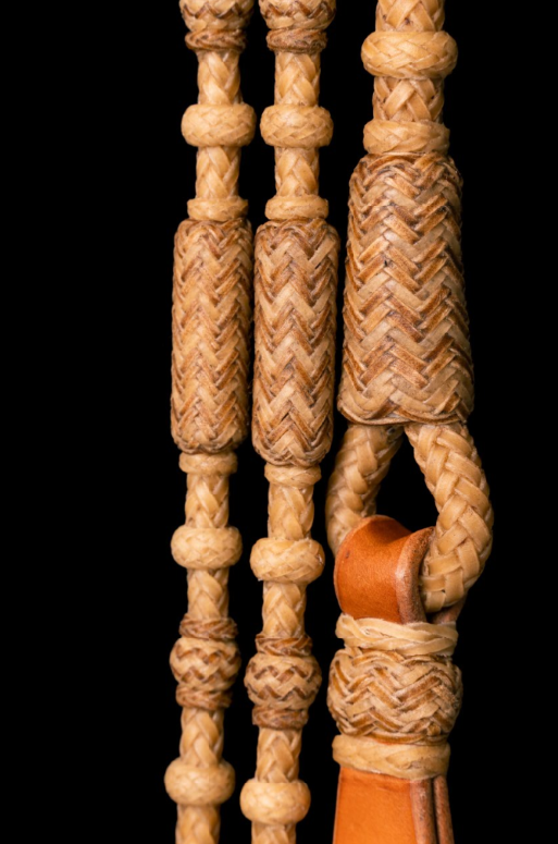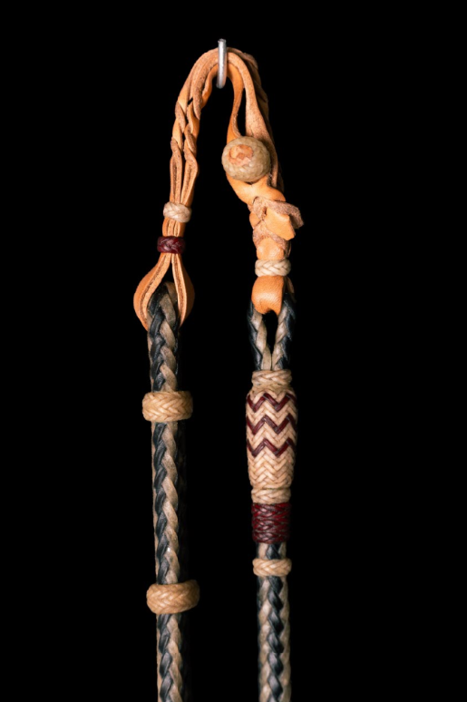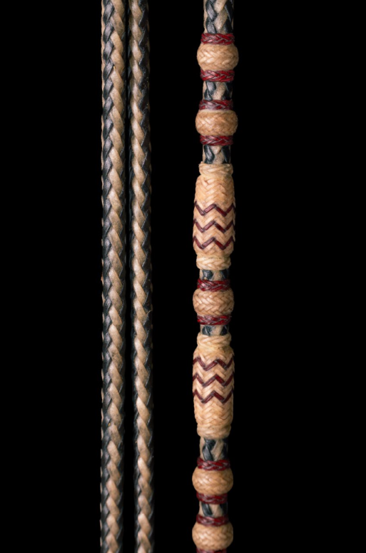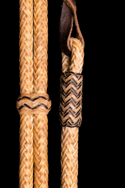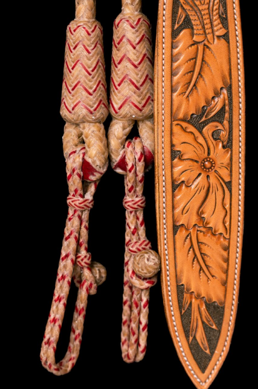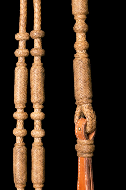 My reins are 12 plait reins and 16 plait romal made from a hide that the hair was removed using the scalding method. The long knots on the reins and romal are a checkered pattern with a red string for the interweave that was dyed with rit dye. The romal has a twisted rawhide core to give it the desired feel. The popper was crafted by Bill Zumstein.