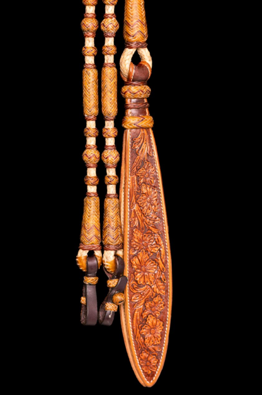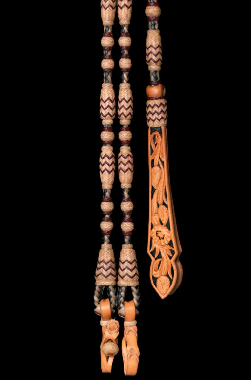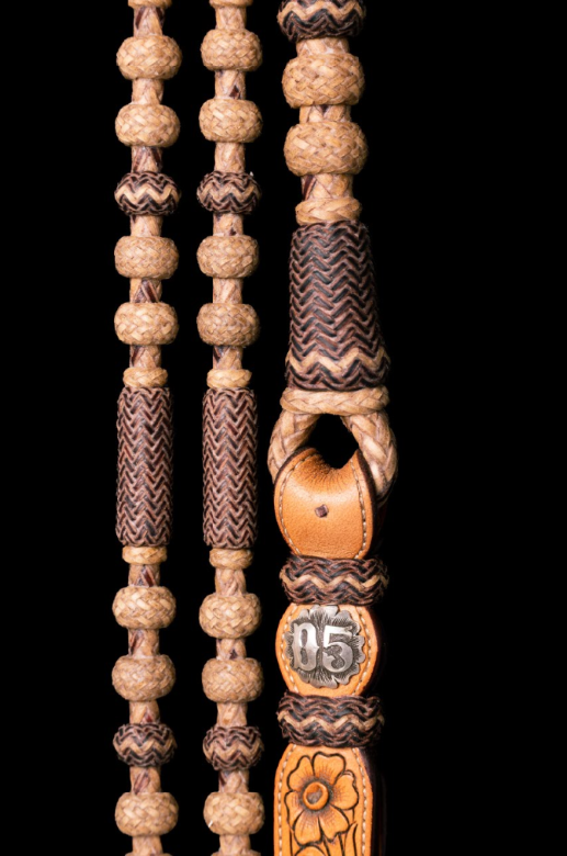 We have a 12 plait rein and a 16 plait romal braided over rawhide cores with wine colored fleck in the body string and wine colored buttons. All the buttons on these reins are 8 bight Bomba Zurta knots, alternating between Herringbone and Guacho weave. Showcasing a nice variation in buttons. Featuring a silver palm tube and makers concho by Carlee Stutz and a hand carved popper by Jedidiah Rice.