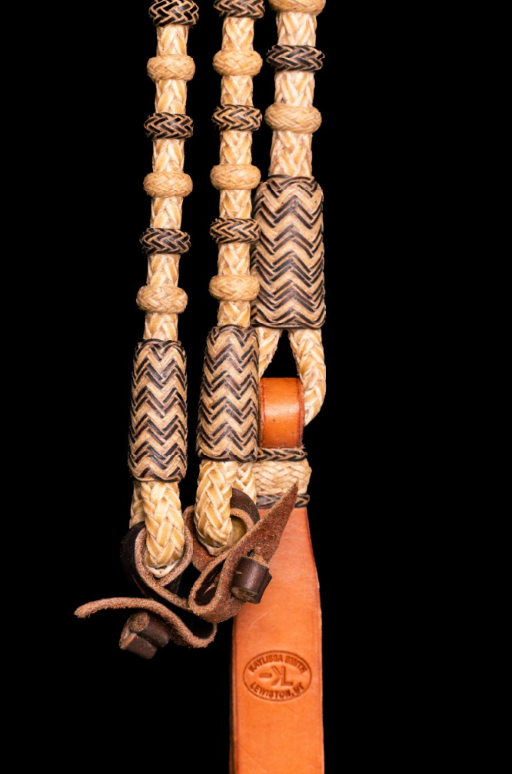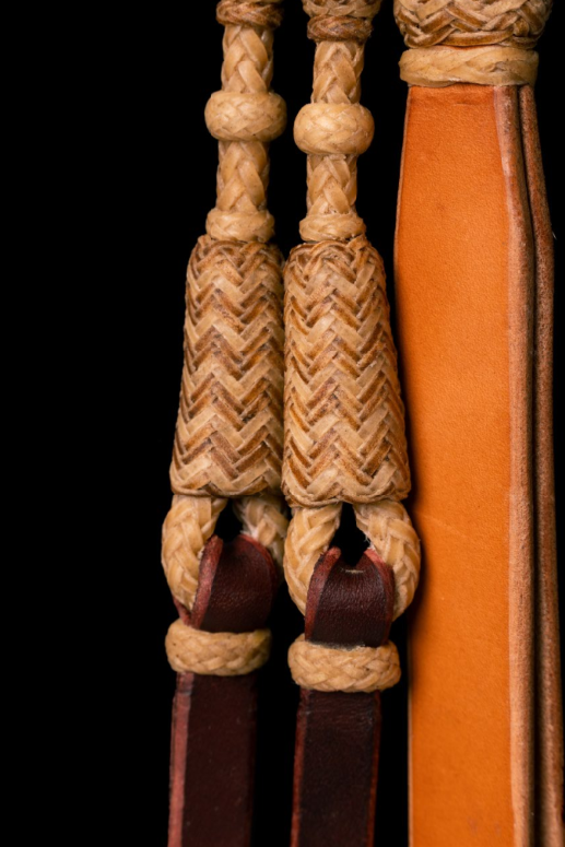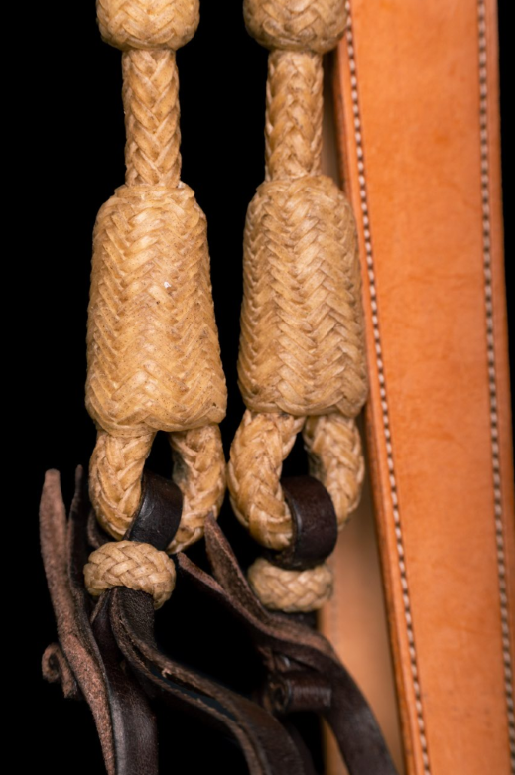 To complete the set with functionality in mind, I chose to use latigo leather rein/romal connectors, which are finished with matching rawhide knots.