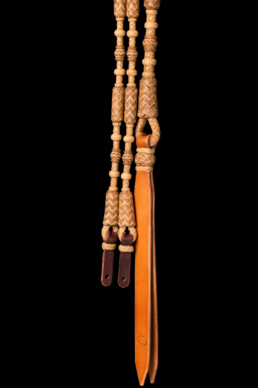 Twelve plait rein with a sixteen plait romel. They are natural color bodies, and the buttons have subtle brown interweave. the connector has a braided palm knot in lieu of a palm concho. 42 inches long.