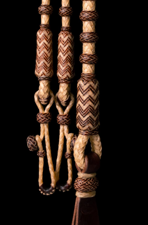 This set is 12 strands in the reins and 16 strands in the Romel. With two different variations of the Bomba zurda foundation. I used both the herring bone and gaucho interweaves with a bit of natural rawhide for the contrast and interweaves.